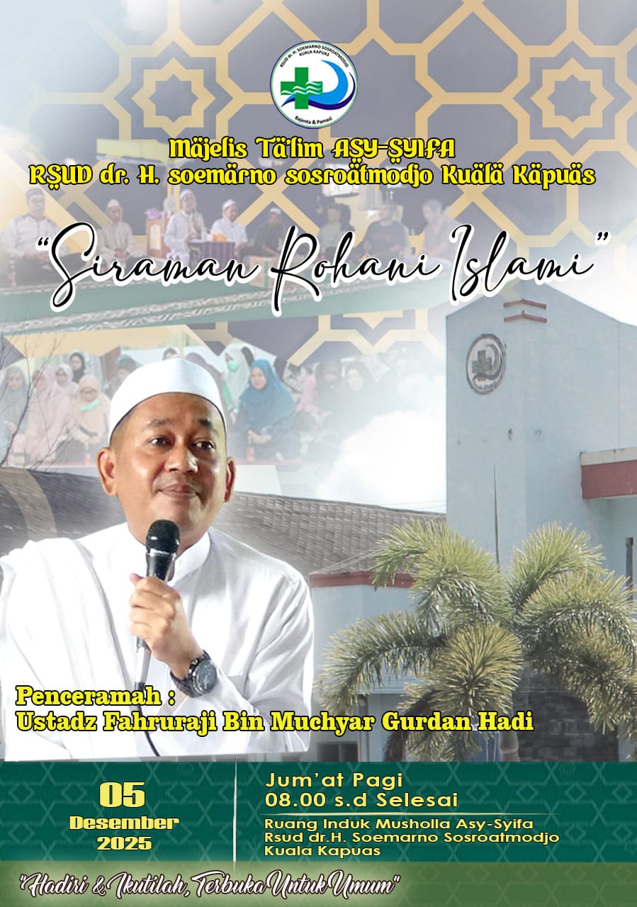 KUALA KAPUAS – Mengisi kegiatan Jum’at Beriman, RSUD dr. H. Soemarno Sosroatmodjo Kuala Kapuas pada Hari Jum’at, tanggal 5 Desember 2025 melalui Majelis As Syifa yang merupakan perkumpulan kegiatan kerohanian karyawan / karyawati RSUD Kapuas yang beragama Islam melaksanakan Siraman Rohani bertempat di Mushola RSUD dr. H. Soemarno Sosroatmodjo Kuala Kapuas Jl. Tambun Bungai No. 16 di Kabupaten Kapuas.